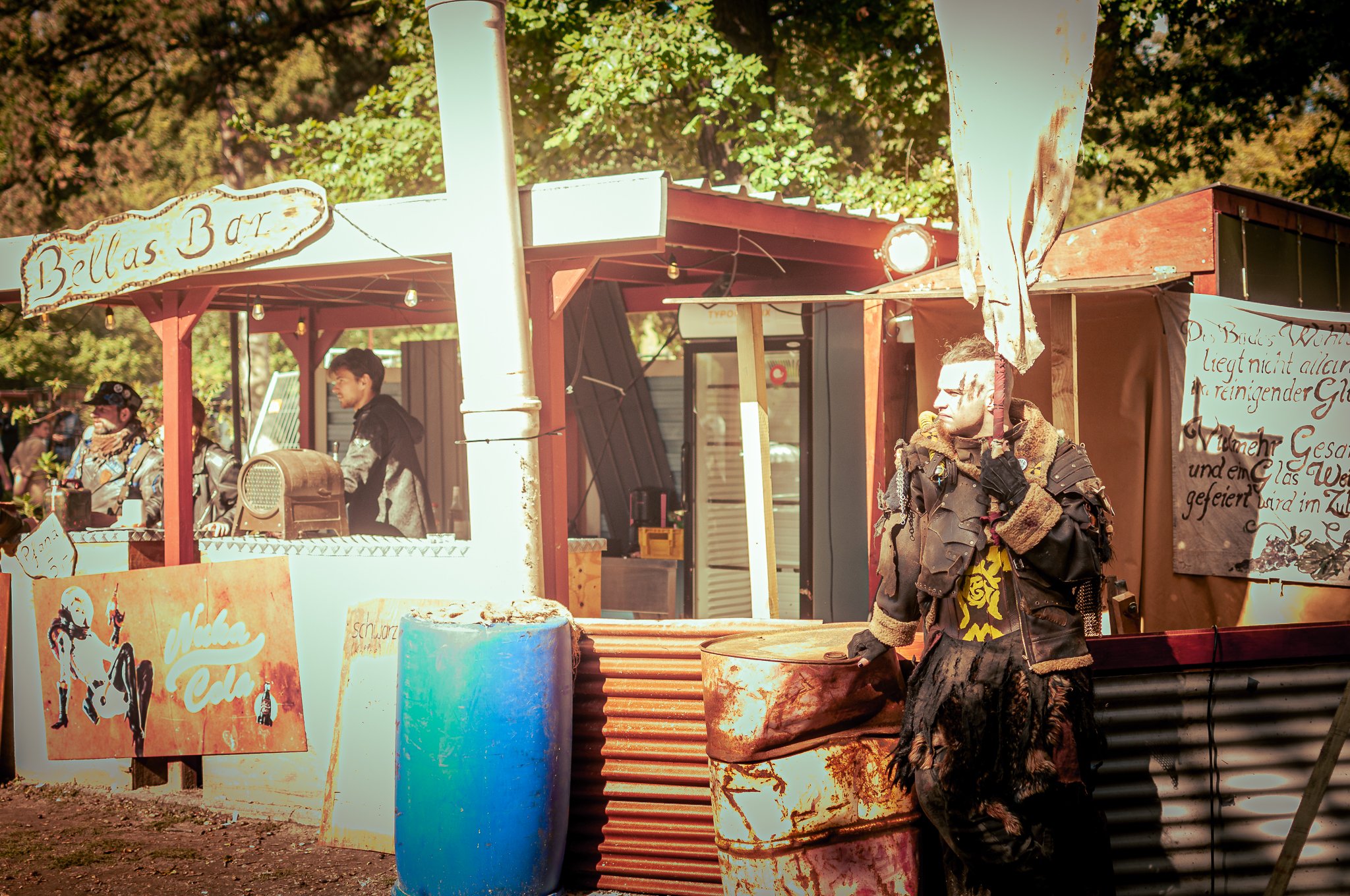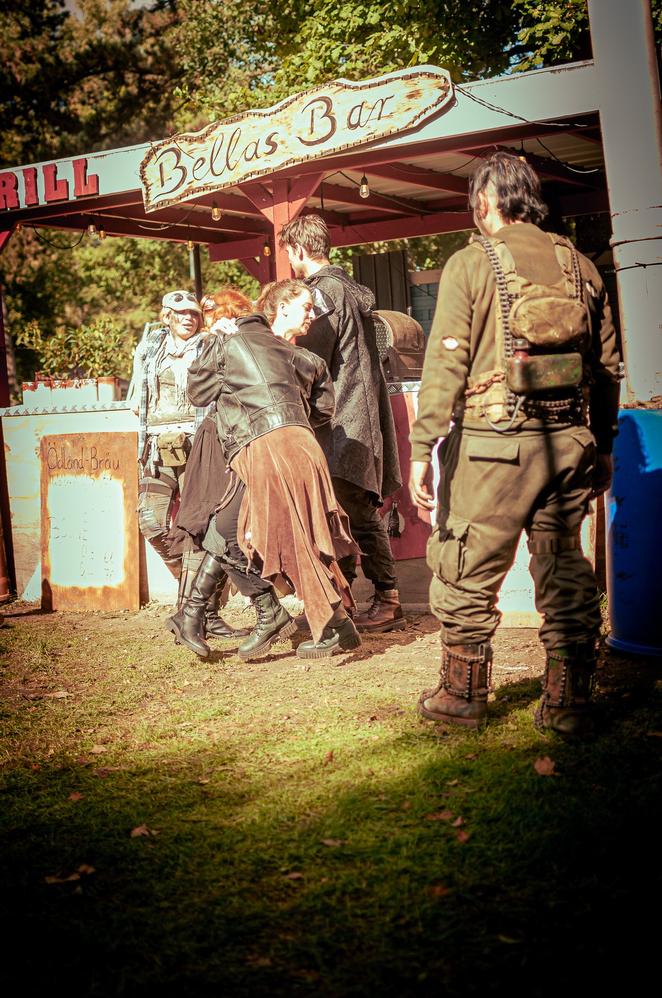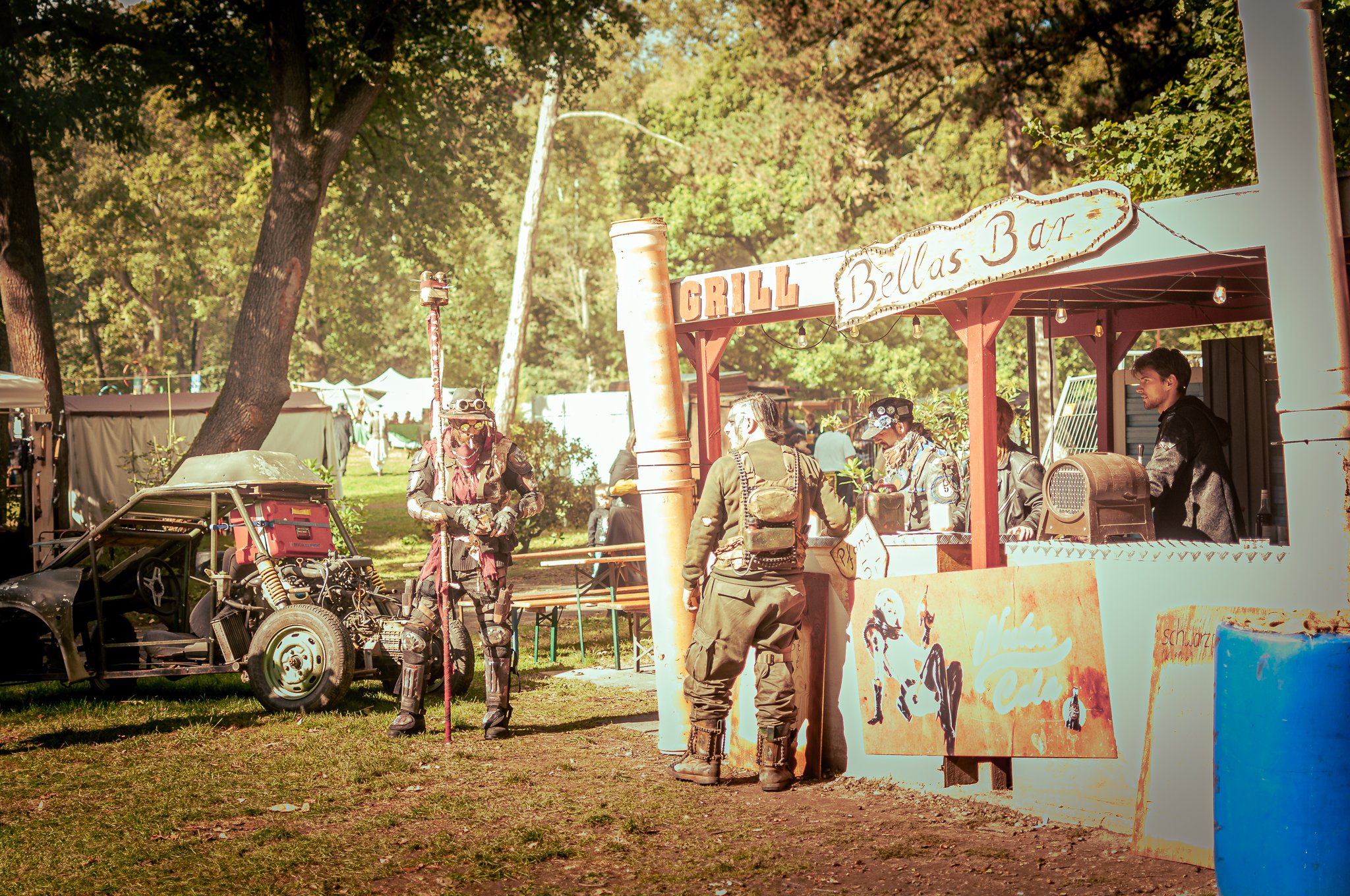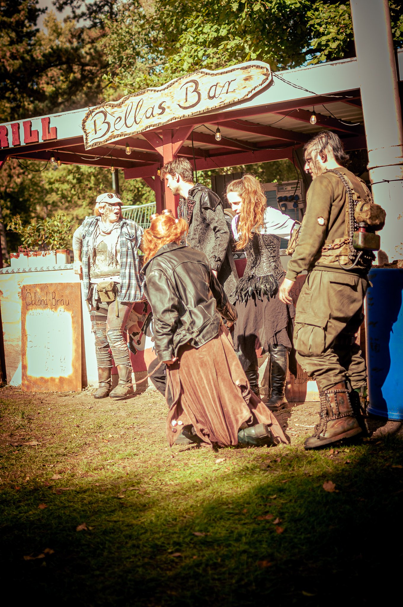 Als sich Samstagabend der Regen und die wütenden Windböen etwas beruhigt hatten, hieß es natürlich: Party. Mit Feuershow, lauter Musik, Nebel, wildem Getanze und allem was das Endzeit-Herz begehrt. So war es ein Wunder, dass die Energie am Sonntag nach wie vor gegeben war, die endlich auftauchende Sonne hat aber mit Sicherheit ihren Teil dazu beigetragen. Da gemeinsam mit der Temperatur auch die Besucherzahl stieg, lohnte sich hier auch der zusätzliche Showact mit unseren neuen Freunden von Bellas Bar: Der Tumult! Die Showkämpfe entlockten den Zuschauern zahlreiche Ohs und Ahs, eventuell Besorgte können wir beruhigen: War natürlich alles nur gespielt, und bis auf einen Kratzer im Motorrad ist niemandem etwas passiert.