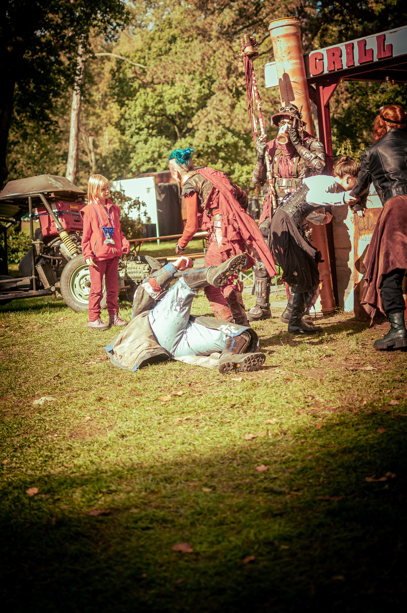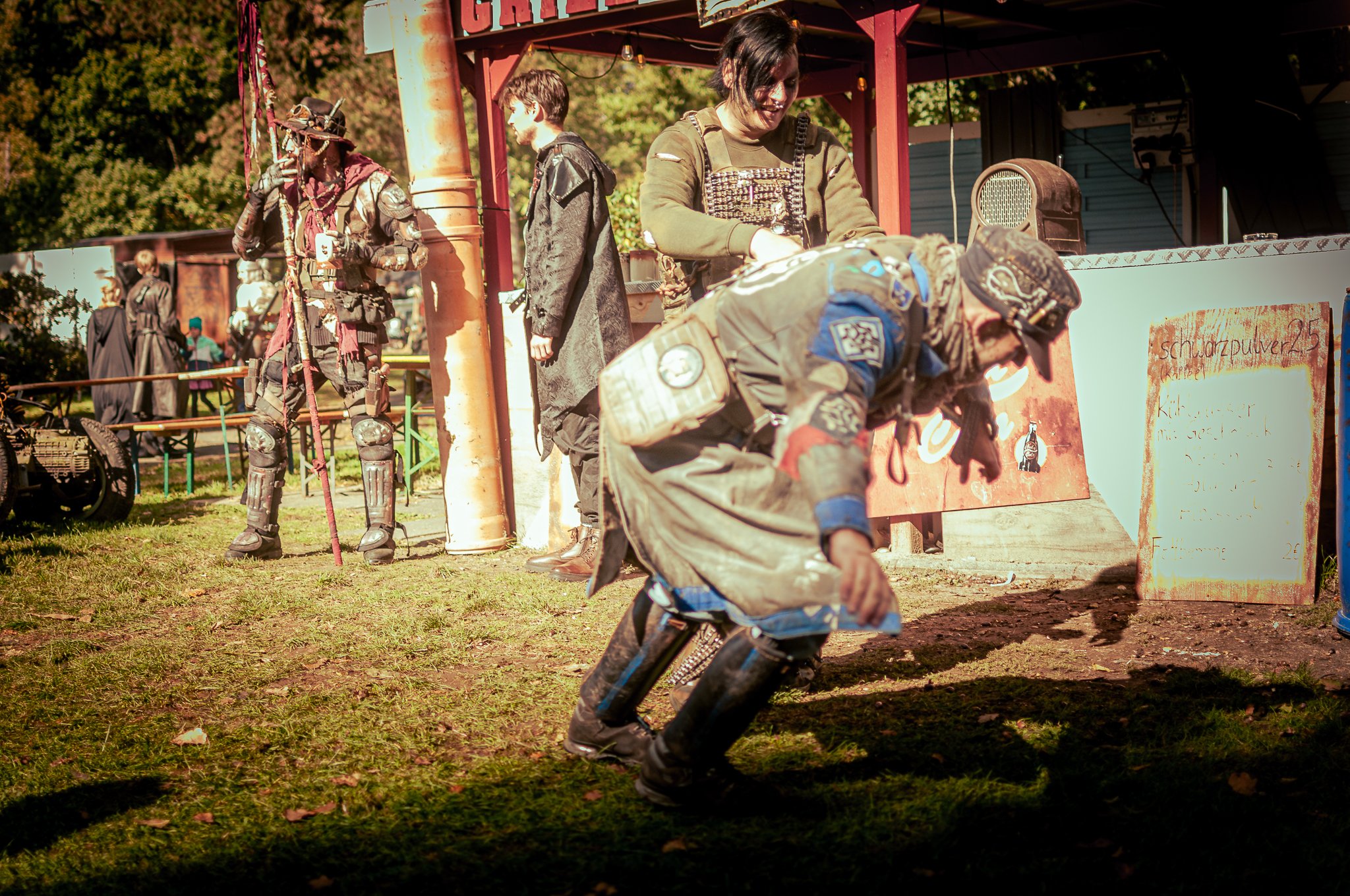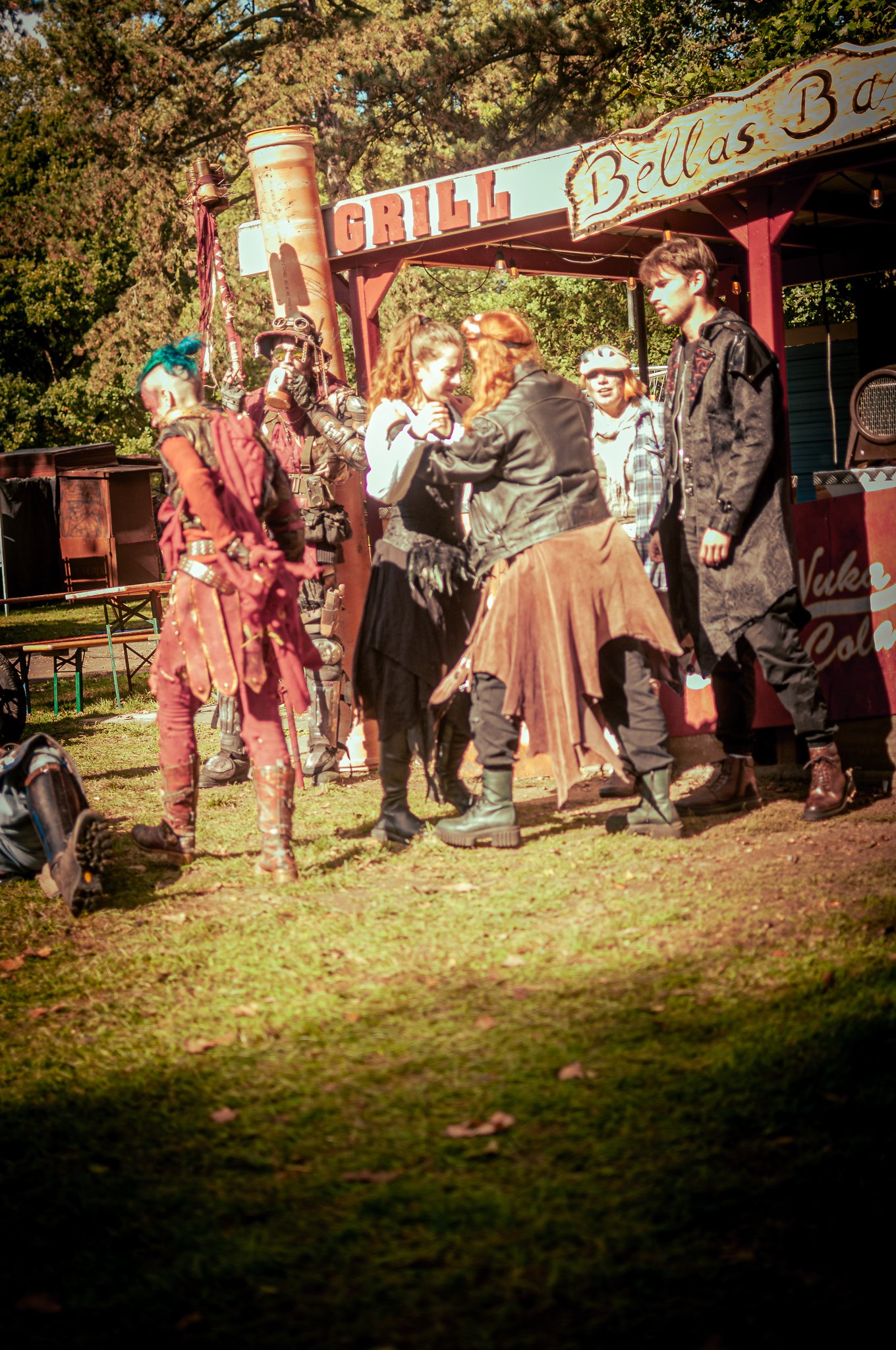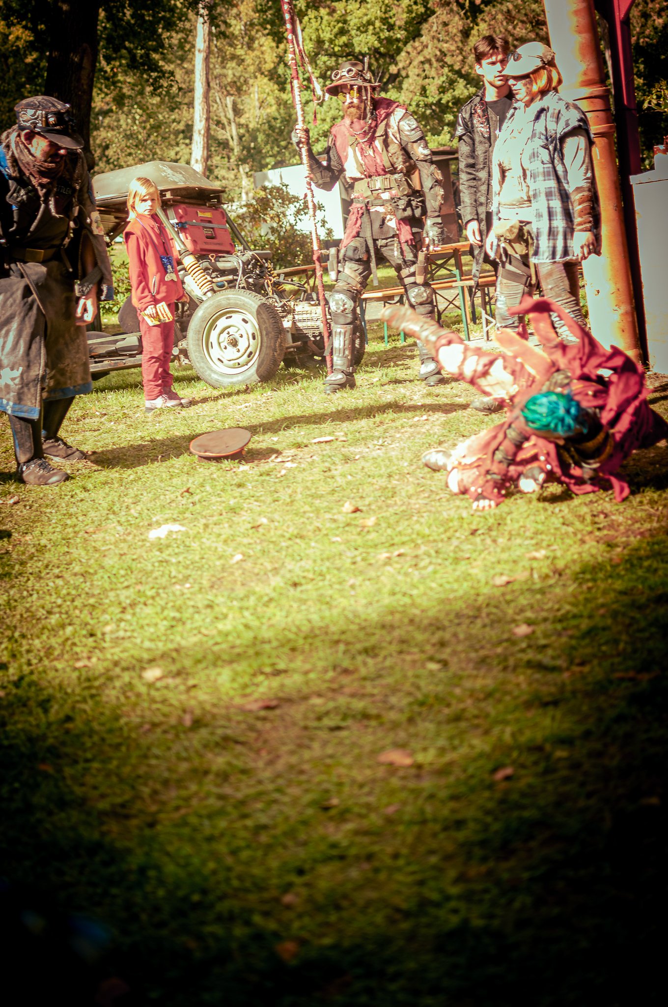Als sich Samstagabend der Regen und die wütenden Windböen etwas beruhigt hatten, hieß es natürlich: Party. Mit Feuershow, lauter Musik, Nebel, wildem Getanze und allem was das Endzeit-Herz begehrt. So war es ein Wunder, dass die Energie am Sonntag nach wie vor gegeben war, die endlich auftauchende Sonne hat aber mit Sicherheit ihren Teil dazu beigetragen. Da gemeinsam mit der Temperatur auch die Besucherzahl stieg, lohnte sich hier auch der zusätzliche Showact mit unseren neuen Freunden von Bellas Bar: Der Tumult! Die Showkämpfe entlockten den Zuschauern zahlreiche Ohs und Ahs, eventuell Besorgte können wir beruhigen: War natürlich alles nur gespielt, und bis auf einen Kratzer im Motorrad ist niemandem etwas passiert.