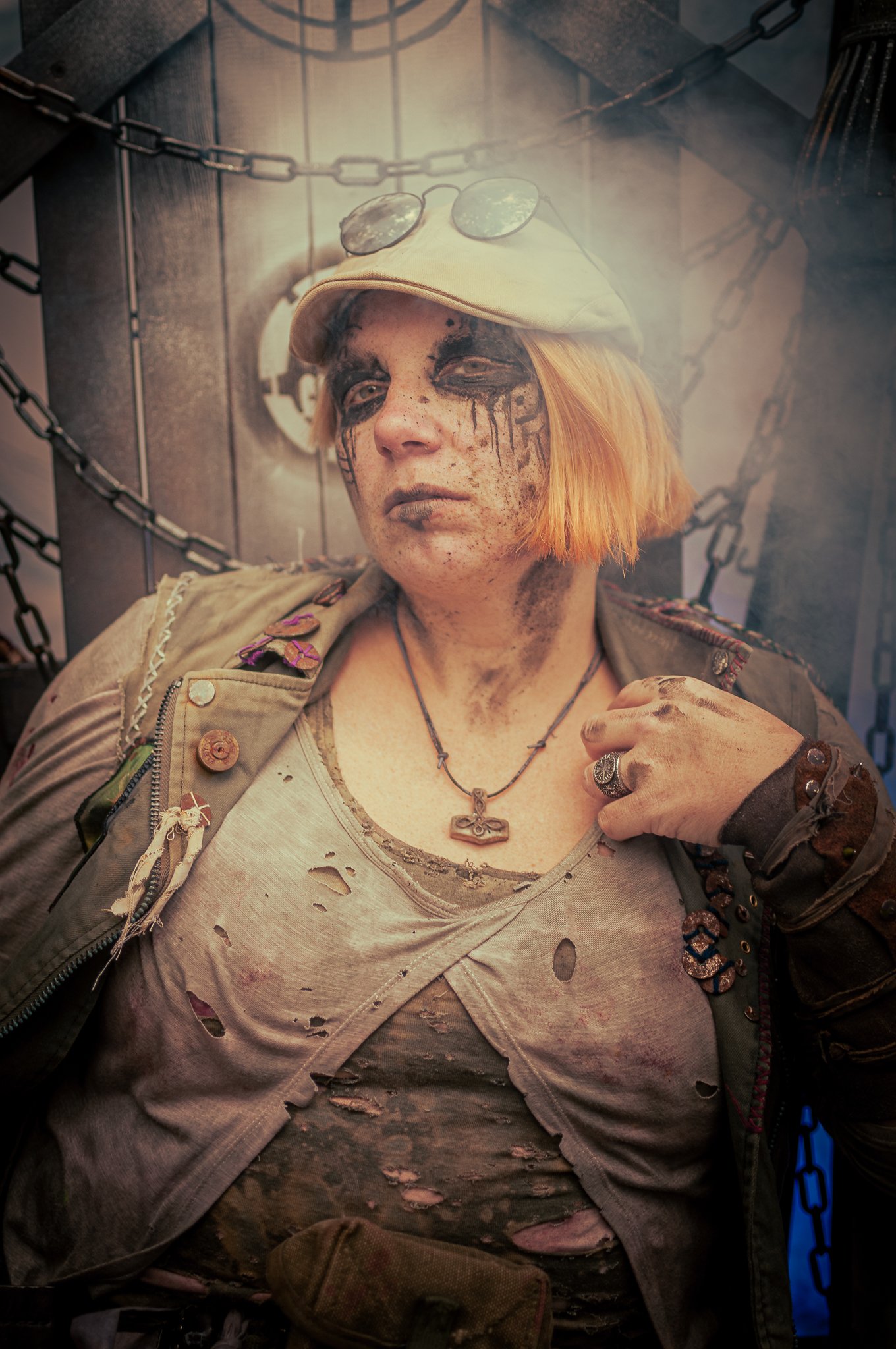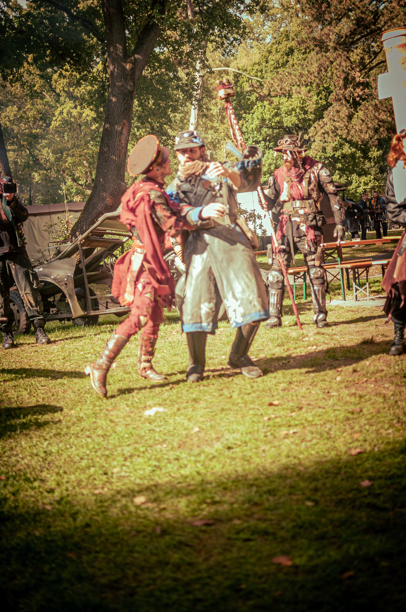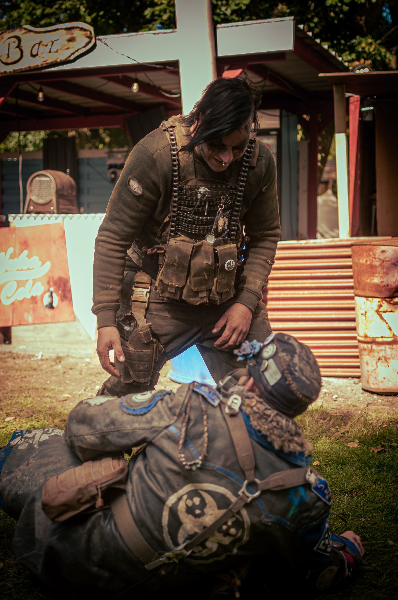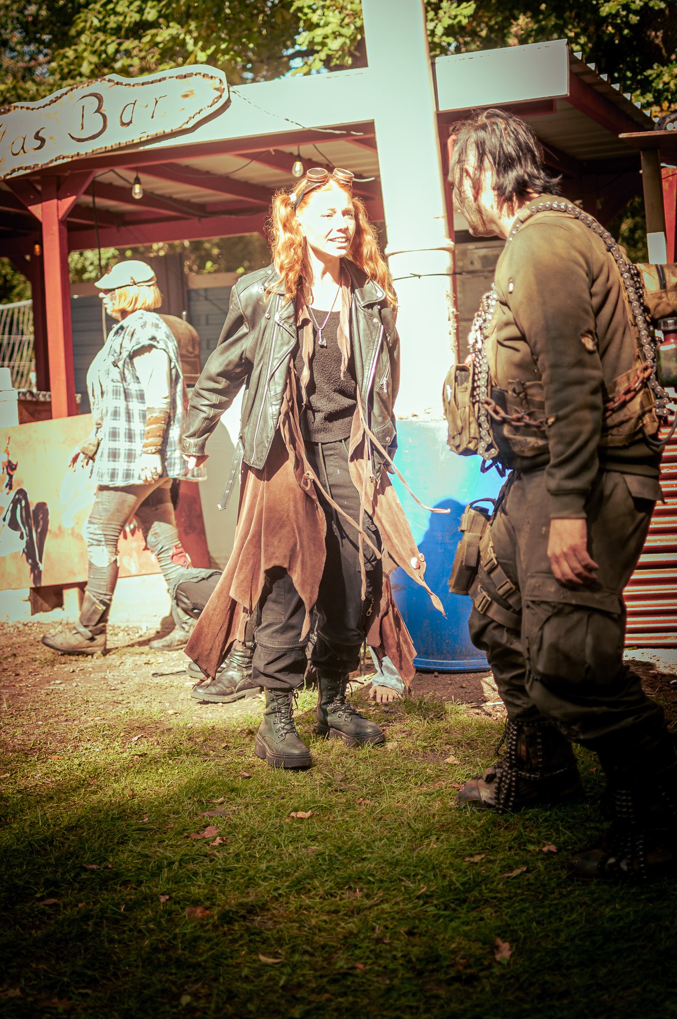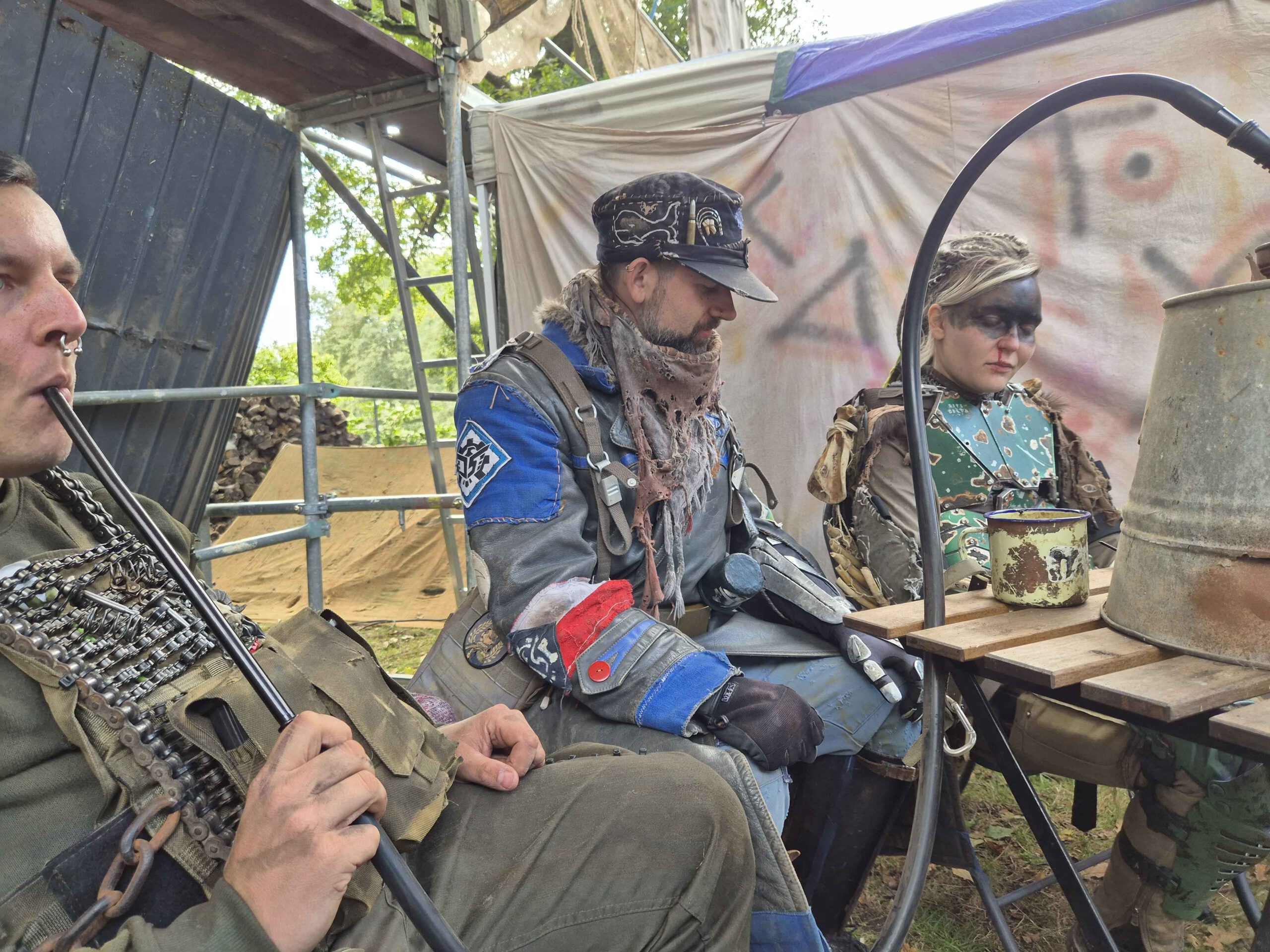 Als sich Samstagabend der Regen und die wütenden Windböen etwas beruhigt hatten, hieß es natürlich: Party. Mit Feuershow, lauter Musik, Nebel, wildem Getanze und allem was das Endzeit-Herz begehrt. So war es ein Wunder, dass die Energie am Sonntag nach wie vor gegeben war, die endlich auftauchende Sonne hat aber mit Sicherheit ihren Teil dazu beigetragen. Da gemeinsam mit der Temperatur auch die Besucherzahl stieg, lohnte sich hier auch der zusätzliche Showact mit unseren neuen Freunden von Bellas Bar: Der Tumult! Die Showkämpfe entlockten den Zuschauern zahlreiche Ohs und Ahs, eventuell Besorgte können wir beruhigen: War natürlich alles nur gespielt, und bis auf einen Kratzer im Motorrad ist niemandem etwas passiert.
